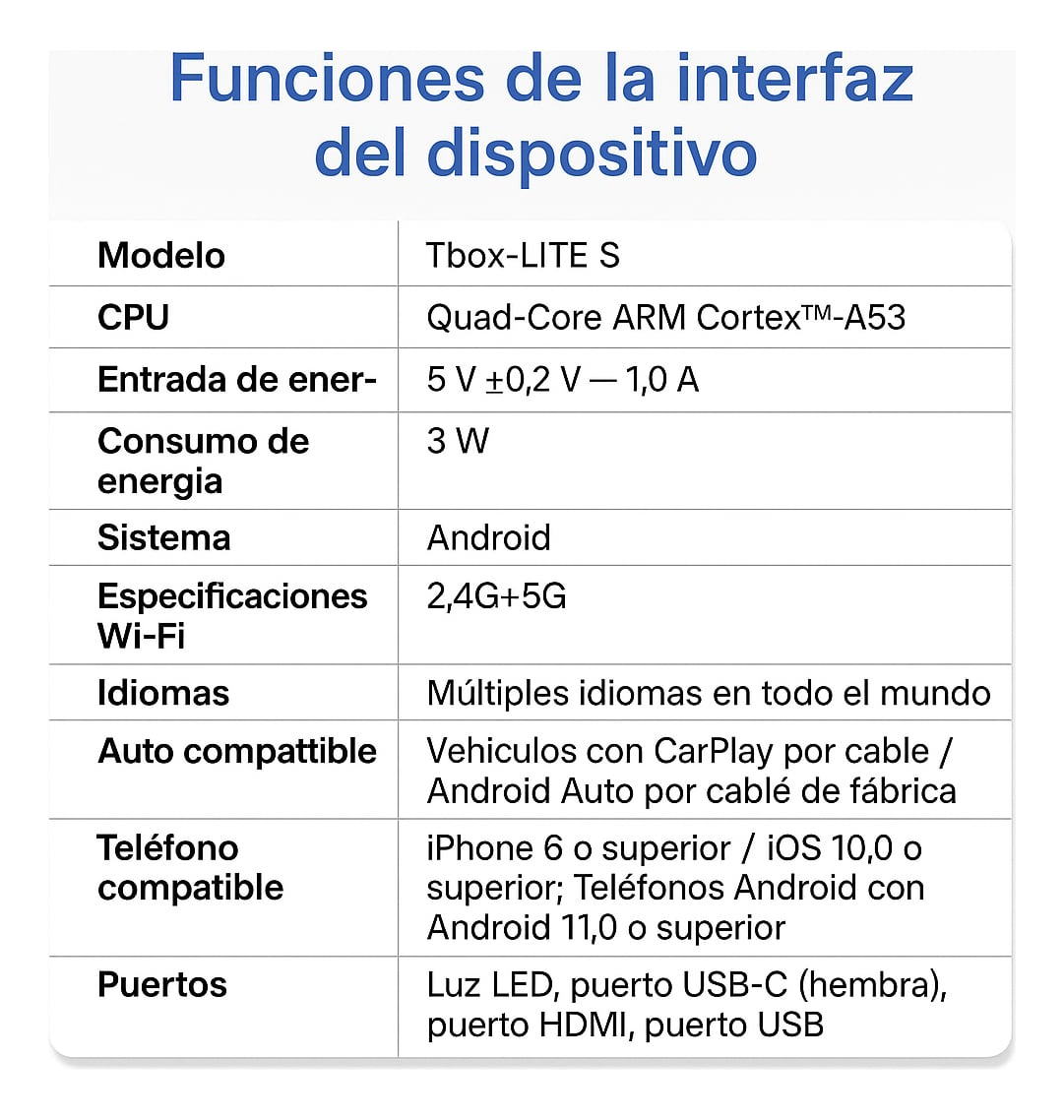 Funciona con vehículos que cuentan con Android Auto o CarPlay por cable. Solo necesitás conectar el dispositivo al puerto USB del auto y seguir los pasos indicados. No requiere instalación adicional ni accesorios externos.