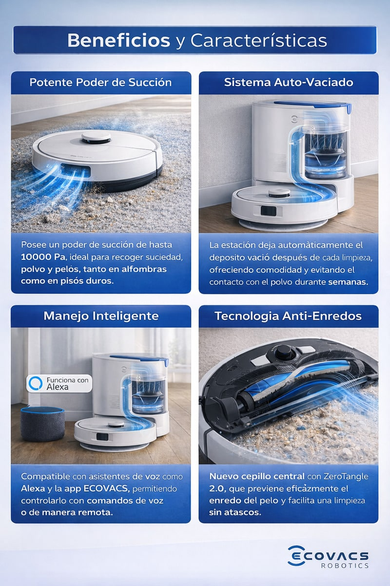 La **ECOVACS DEEBOT N20e PLUS** está diseñada para quienes buscan una limpieza profunda, automática y confiable. Combina aspirado y fregado en una sola pasada, navegación láser de alta precisión y una base de autovaciado que reduce al mínimo la intervención humana. Es la solución ideal para hogares modernos, familias con mascotas y personas que valoran su tiempo.
