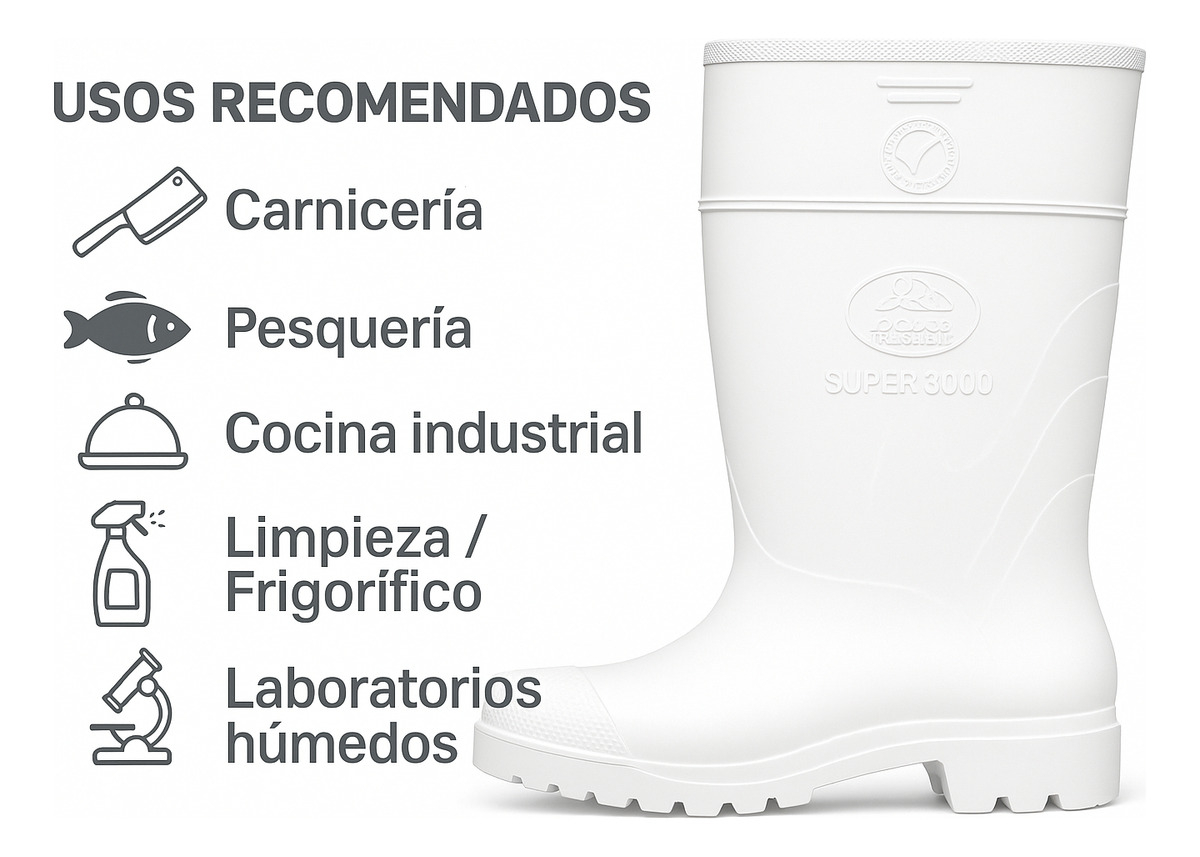La **Bota Super 3000** está fabricada en **PVC 100% virgen de alta pureza**, especialmente desarrollada para entornos donde la higiene, la resistencia química y la tracción son fundamentales. Diseñada para uso intensivo, garantiza protección continua en superficies húmedas, aceitosas o contaminadas, manteniendo al usuario seguro durante toda la jornada laboral.