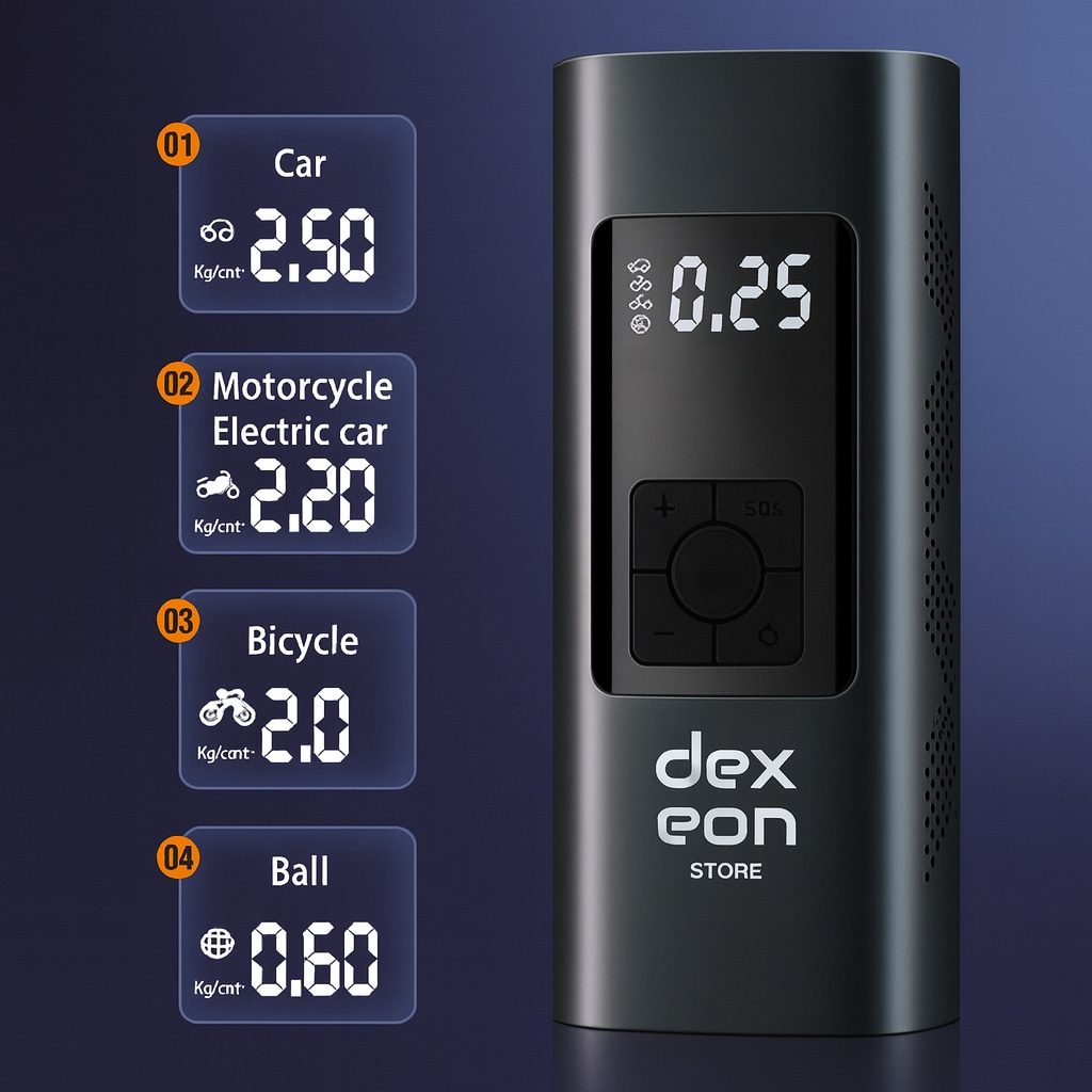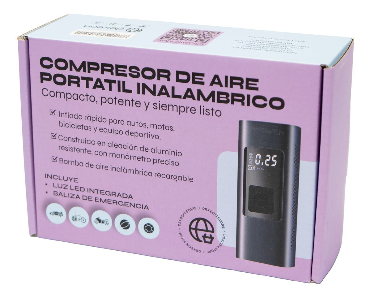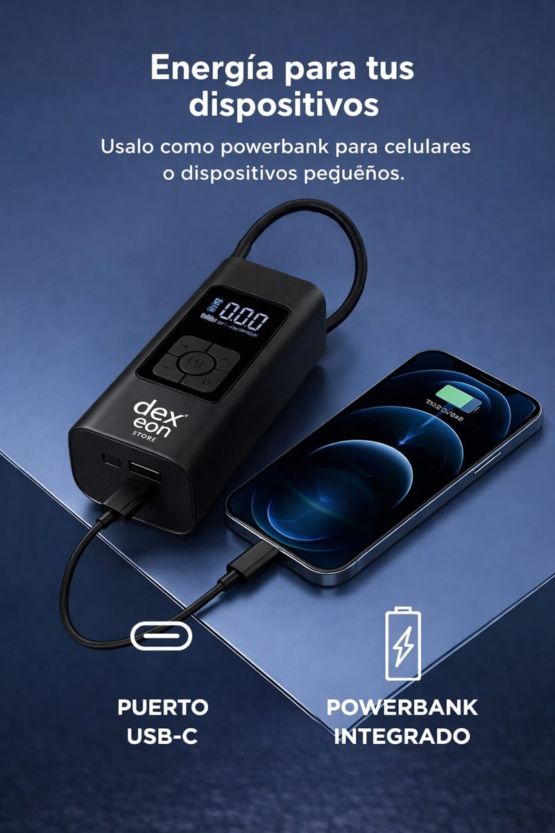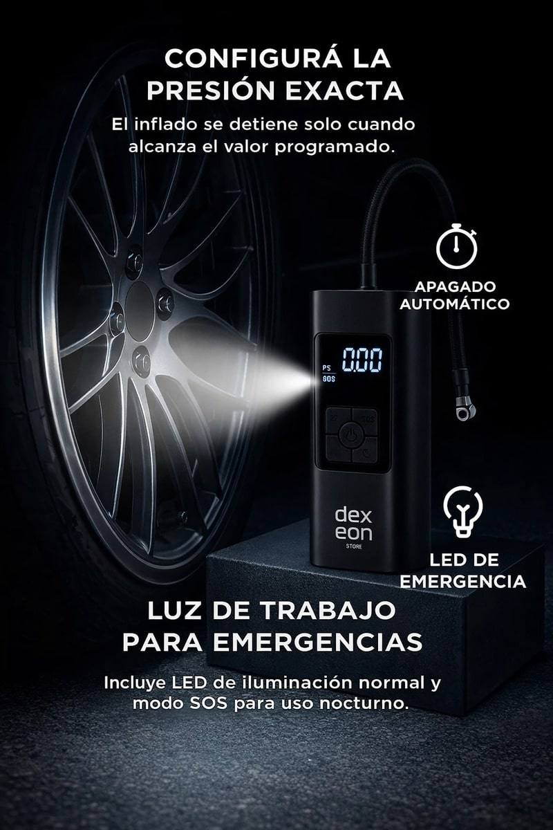 Este compresor portátil DexEon combina potencia profesional con un diseño compacto para que puedas inflar neumáticos y accesorios deportivos en cualquier momento. Su batería recargable elimina cables y complicaciones, convirtiéndolo en un aliado ideal para viajes, rutas, deportes y emergencias. La pantalla LED te permite controlar con exactitud la presión, mientras que sus modos automáticos simplifican el uso incluso para usuarios sin experiencia. Además, su linterna integrada garantiza visibilidad y seguridad en situaciones nocturnas.