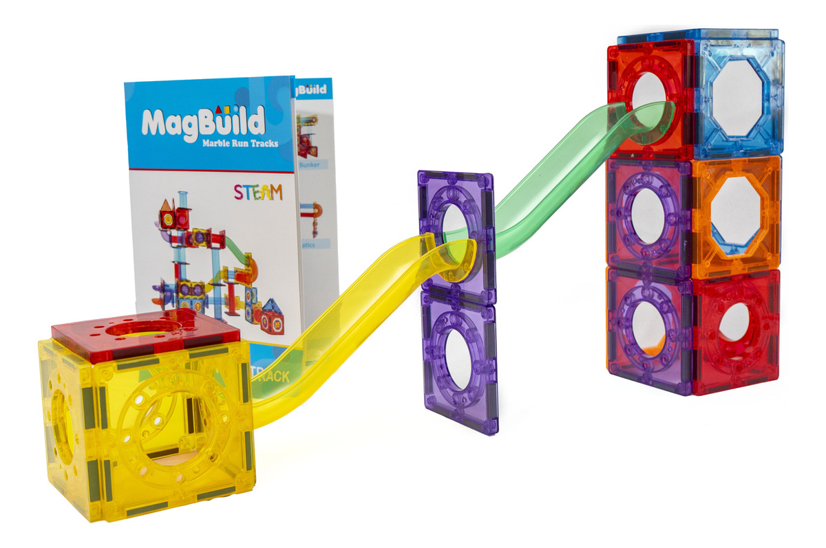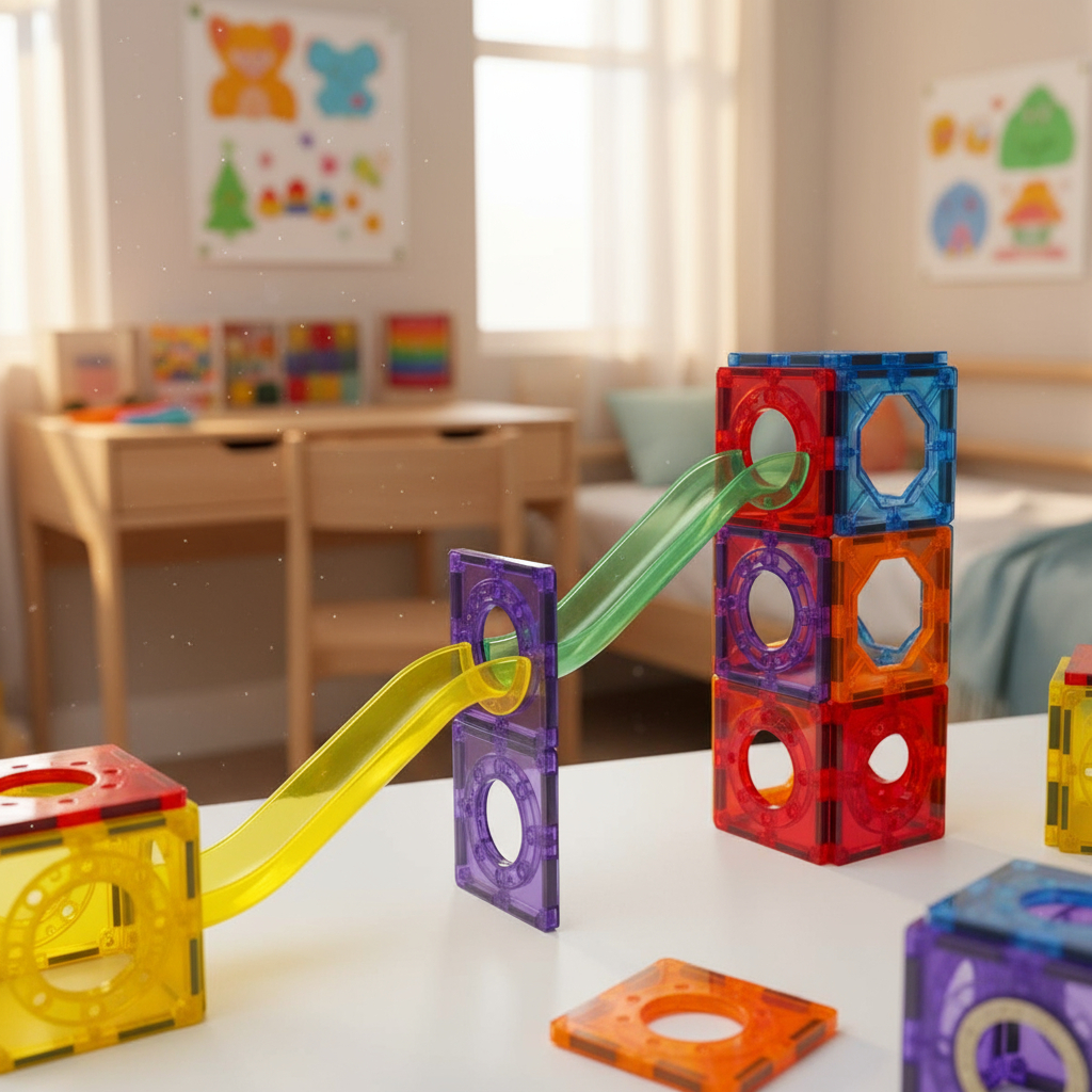 Cada pieza cuenta con **imanes de alta potencia integrados**, lo que garantiza una conexión firme y estable, permitiendo construir desde simples torres hasta complejos circuitos para canicas o pelotas. Su diseño translúcido y colorido capta la atención de los más pequeños, convirtiendo el aprendizaje en una experiencia visual y táctil fascinante.