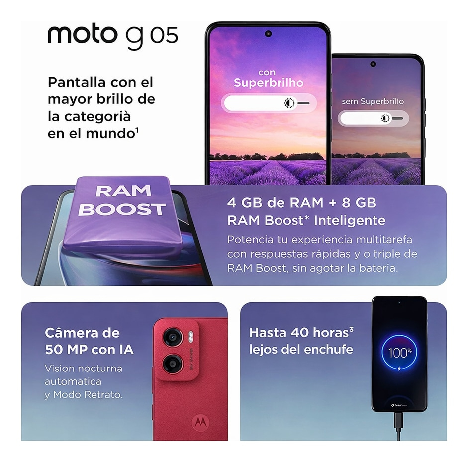 El Moto G05 combina gran almacenamiento, fluidez y excelente cámara, ideal para trabajo, estudio, redes sociales y entretenimiento sin límites.