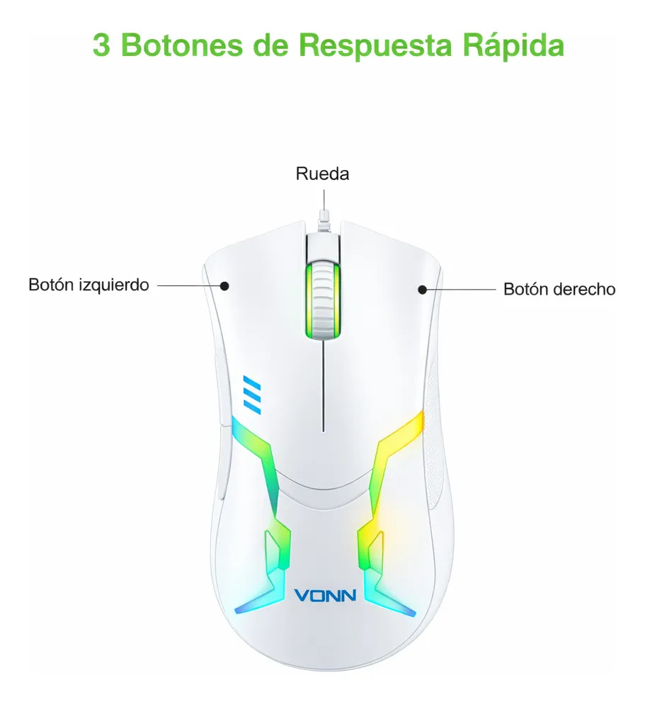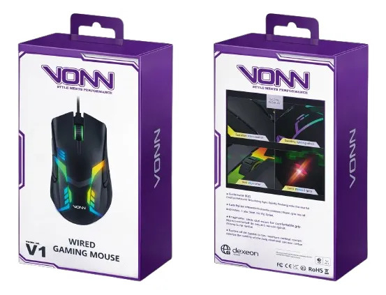 Mouse Gamer VONN V1 con conexión USB, diseñado para ofrecer un rendimiento estable y preciso tanto en gaming como en uso diario. Incorpora un sensor óptico de 1200 DPI que permite movimientos rápidos y controlados, ideal para tareas que requieren precisión y buena respuesta.