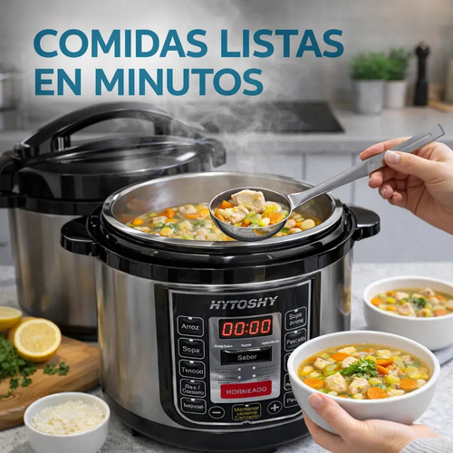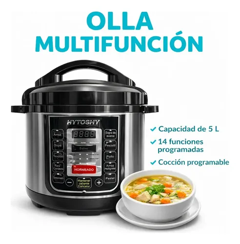 Transformá tu forma de cocinar con la **olla multifunción HYTOSHY**, diseñada para quienes buscan practicidad sin renunciar al sabor. Con su capacidad de **5 litros** y **14 funciones programadas**, es la solución todo en uno para preparar comidas deliciosas en minutos.