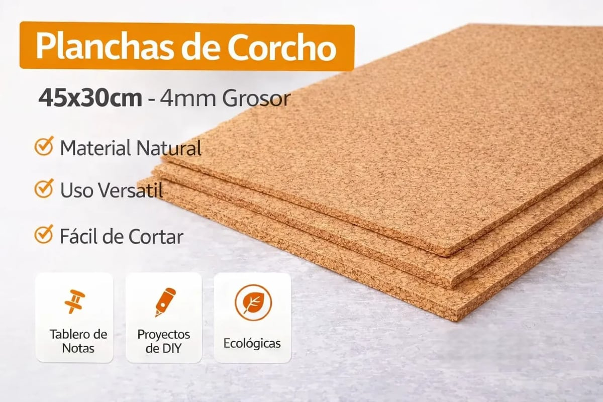 La **plancha de corcho natural 45 x 30 cm de 4 mm** es una solución práctica, resistente y versátil, ideal tanto para uso doméstico como profesional. Fabricada con **corcho 100% natural**, ofrece una excelente combinación de ligereza, firmeza y durabilidad.