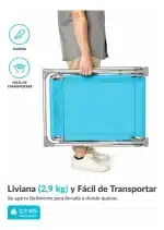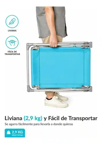 Su sistema de reclinación multiposición permite ajustar el respaldo según tu necesidad: sentarte, descansar o recostarte completamente. Gracias a su diseño liviano y compacto, se pliega en segundos y ocupa muy poco espacio, ideal para llevar en el auto o guardar en casa.