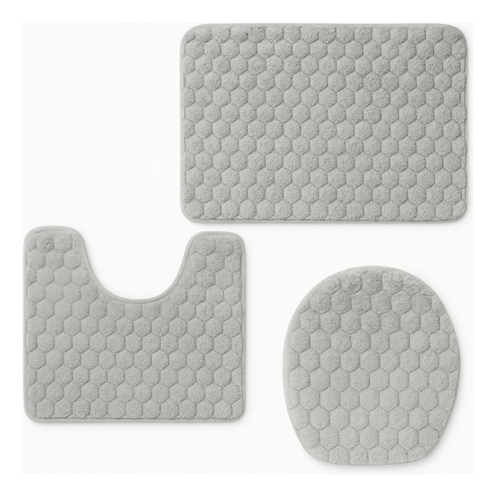 El set incluye **una alfombra rectangular para la ducha o lavabo**, **una alfombra con recorte para la base del inodoro** y **una funda acolchada para la tapa**, logrando un conjunto elegante y coordinado.