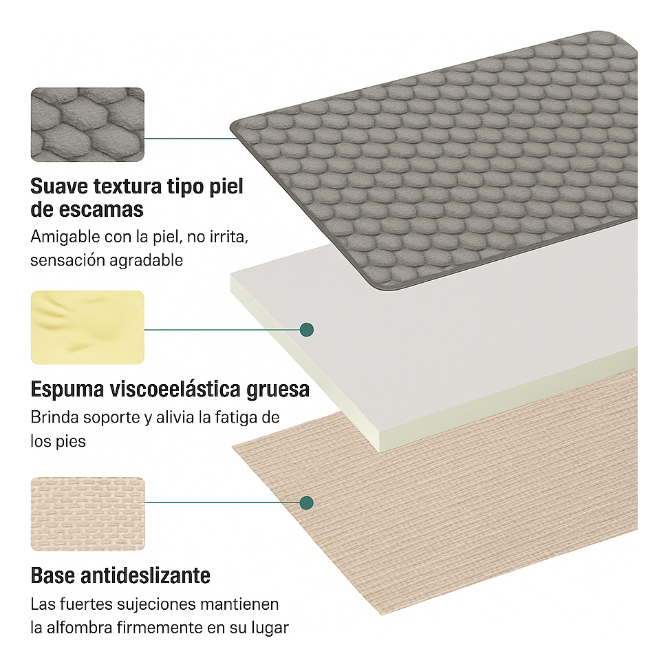 Fabricadas con **microfibra de alta densidad** y **relleno de espuma viscoelástica**, ofrecen una excelente **absorción de agua**, secado rápido y durabilidad. Ideales para mantener tu baño seco, limpio y cómodo en todo momento.