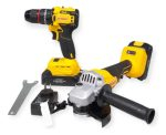 El paquete se presenta en un maletín rígido que facilita el almacenamiento y el traslado de las herramientas. El kit incluye además el cargador correspondiente para mantener el equipo operativo en todo momento. Su diseño combina los colores negro y amarillo, ofreciendo una estética profesional y robusta.