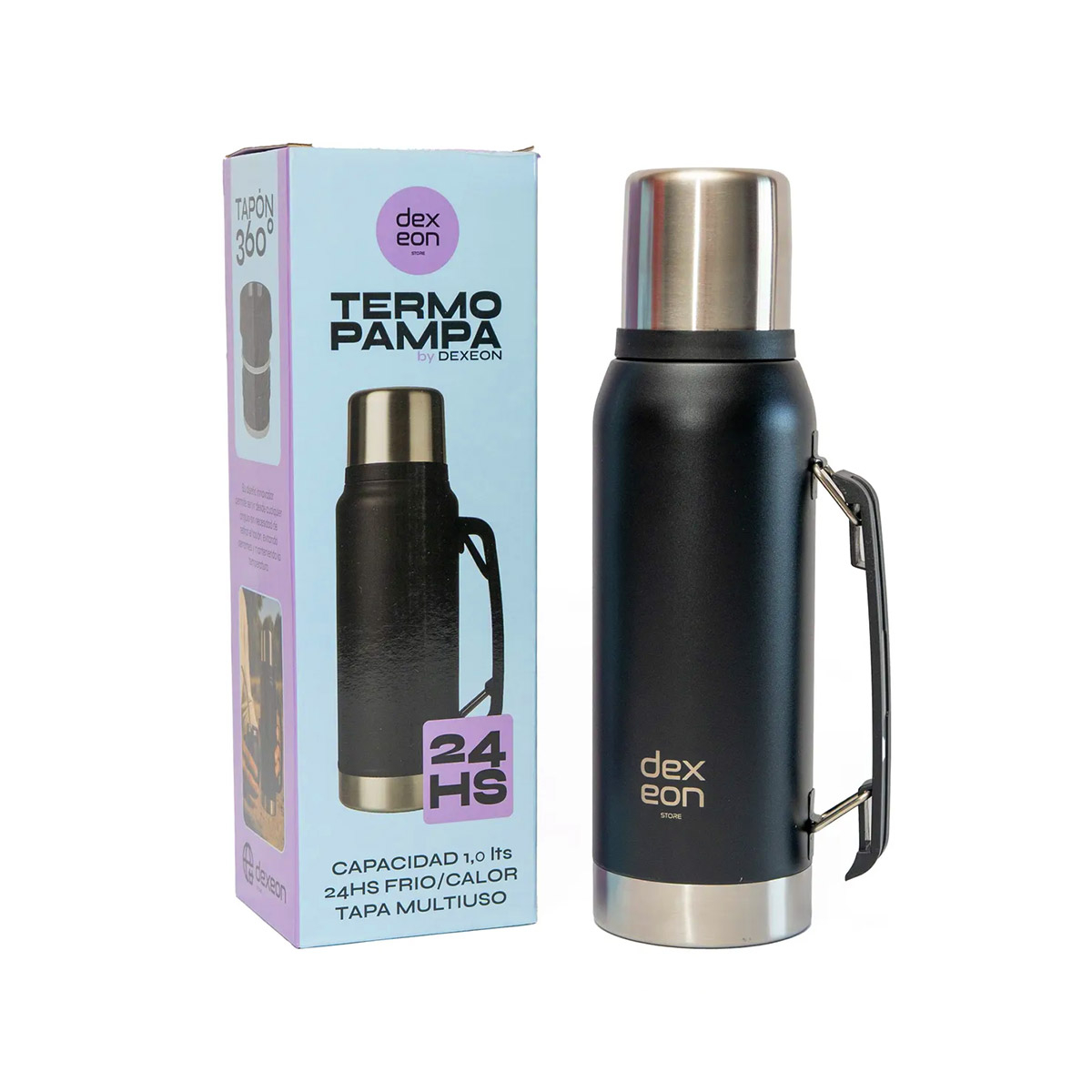 El Termo DexEon Pampa está diseñado para quienes exigen durabilidad, aislamiento de alto nivel y un sistema de vertido seguro y moderno. Su innovador **tapón a rosca 360°** permite servir desde cualquier ángulo sin retirar el tapón, evitando derrames y ayudando a conservar la temperatura por más tiempo. Ideal para uso diario, actividades al aire libre, viajes o jornadas laborales extensas.